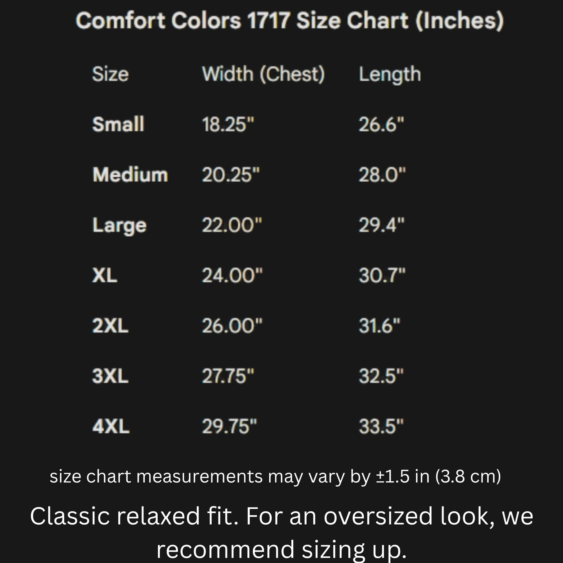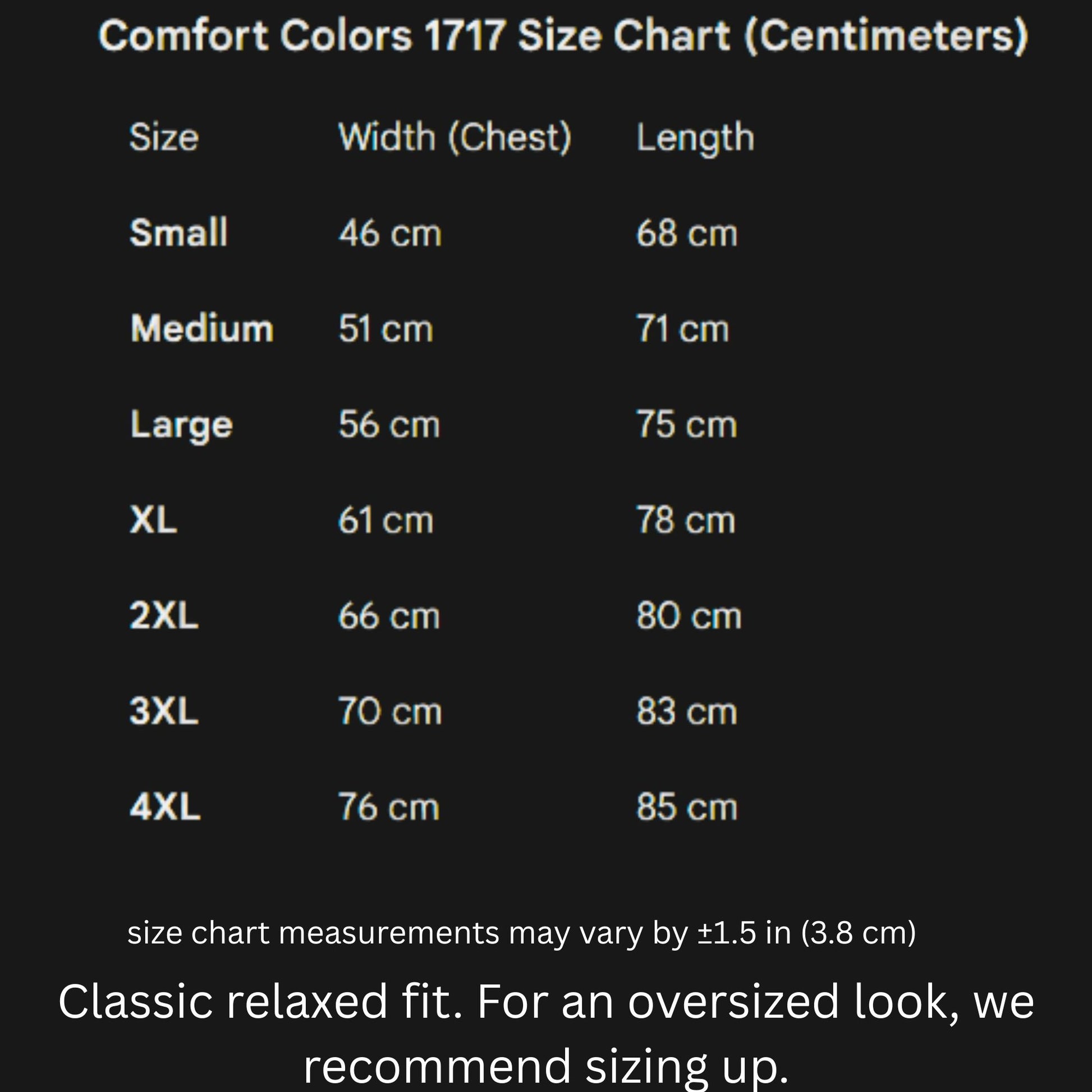 - Available in sizes S–4XL (see Comfort Colors 1717 size chart)