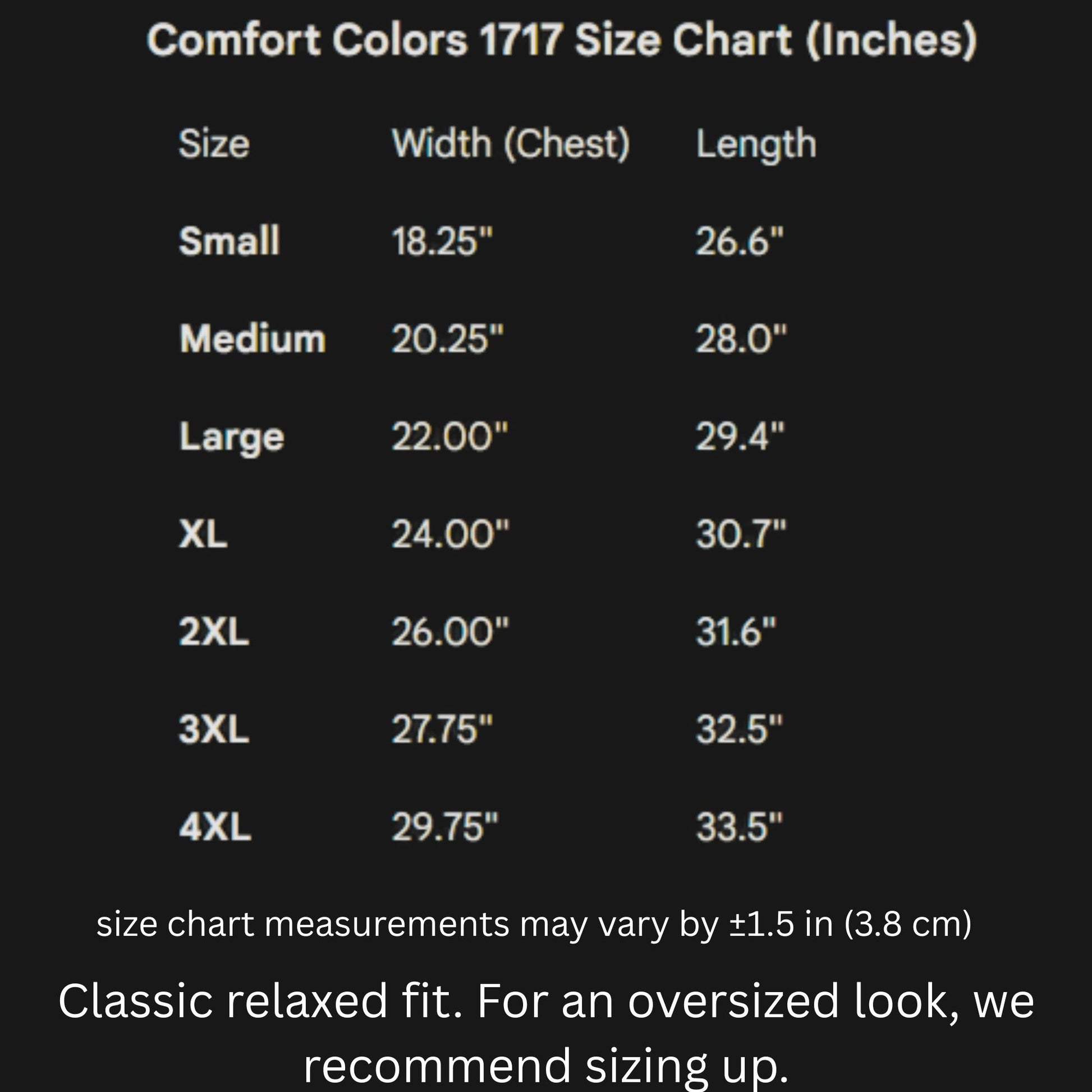- Available in sizes S–4XL (select partners) — consult Comfort Colors 1717 size chart