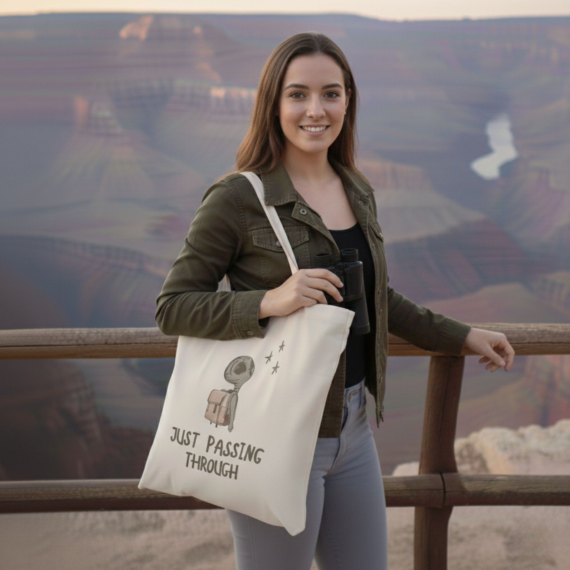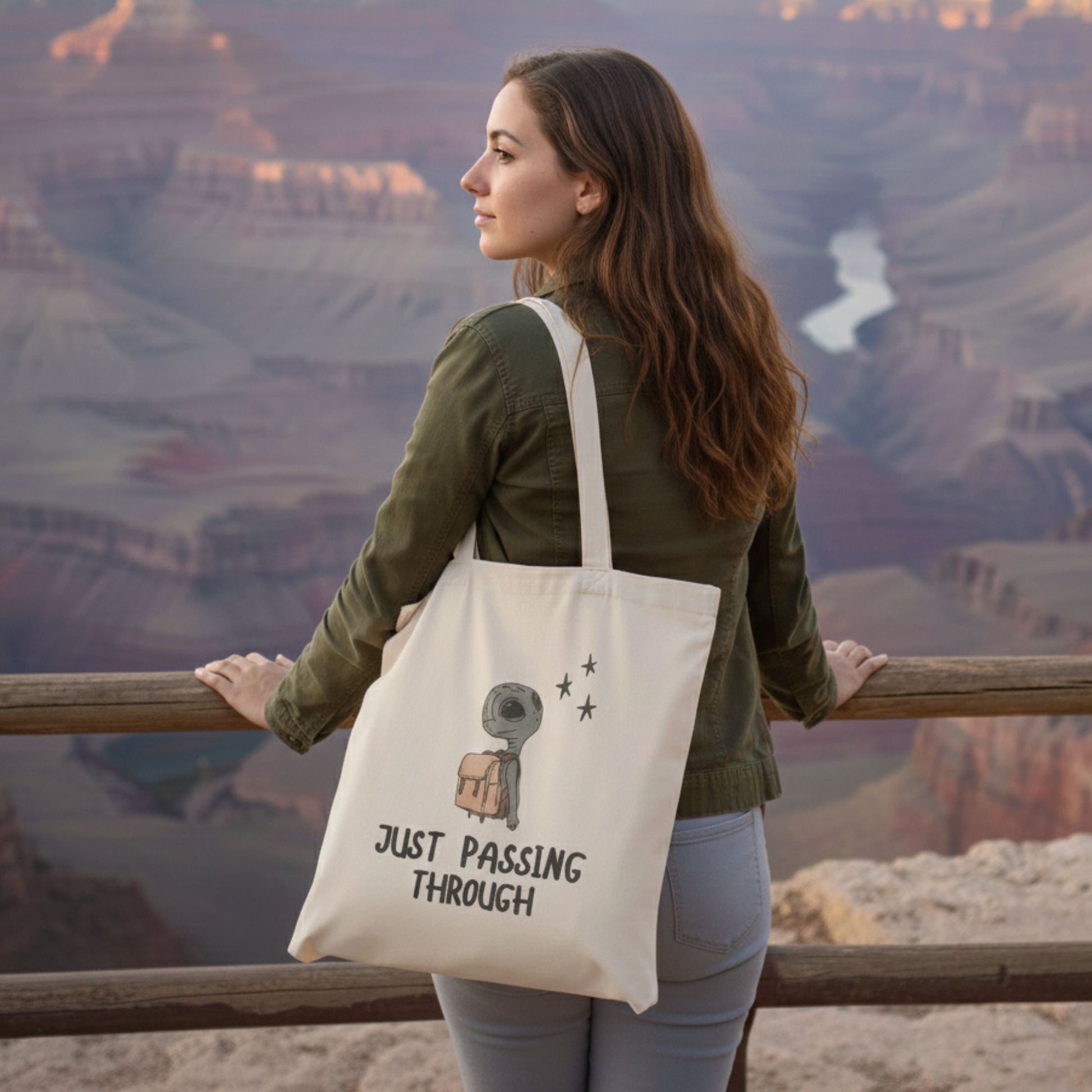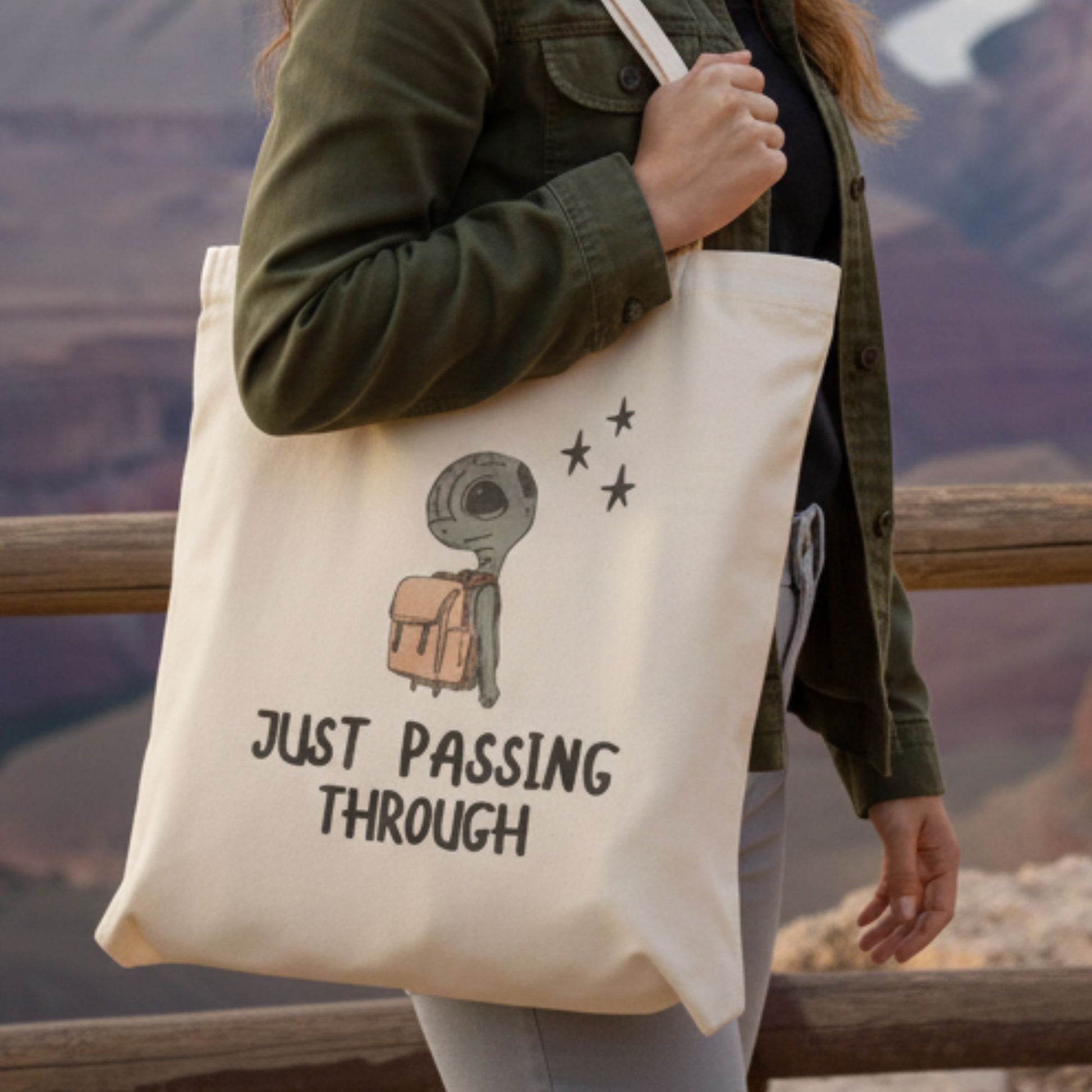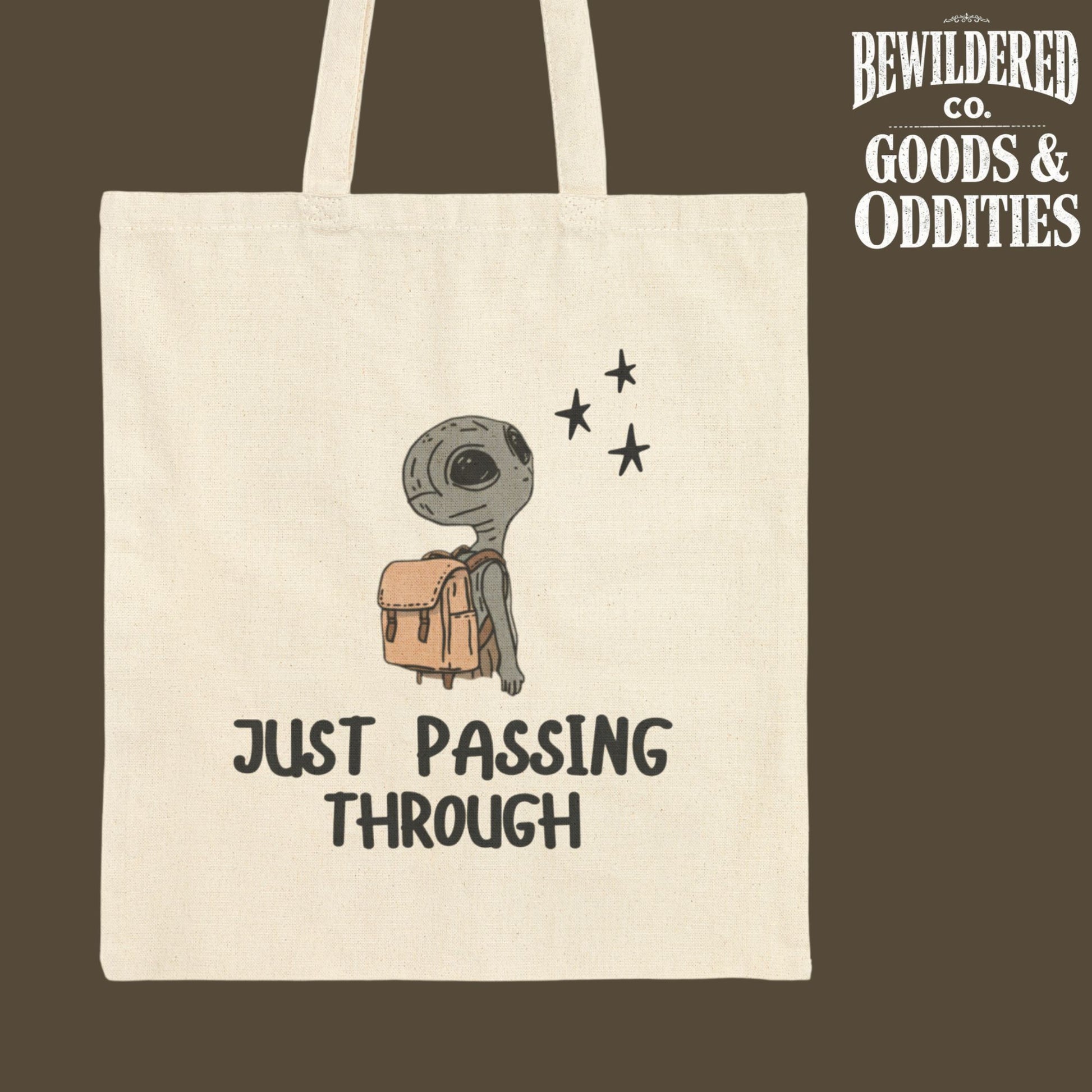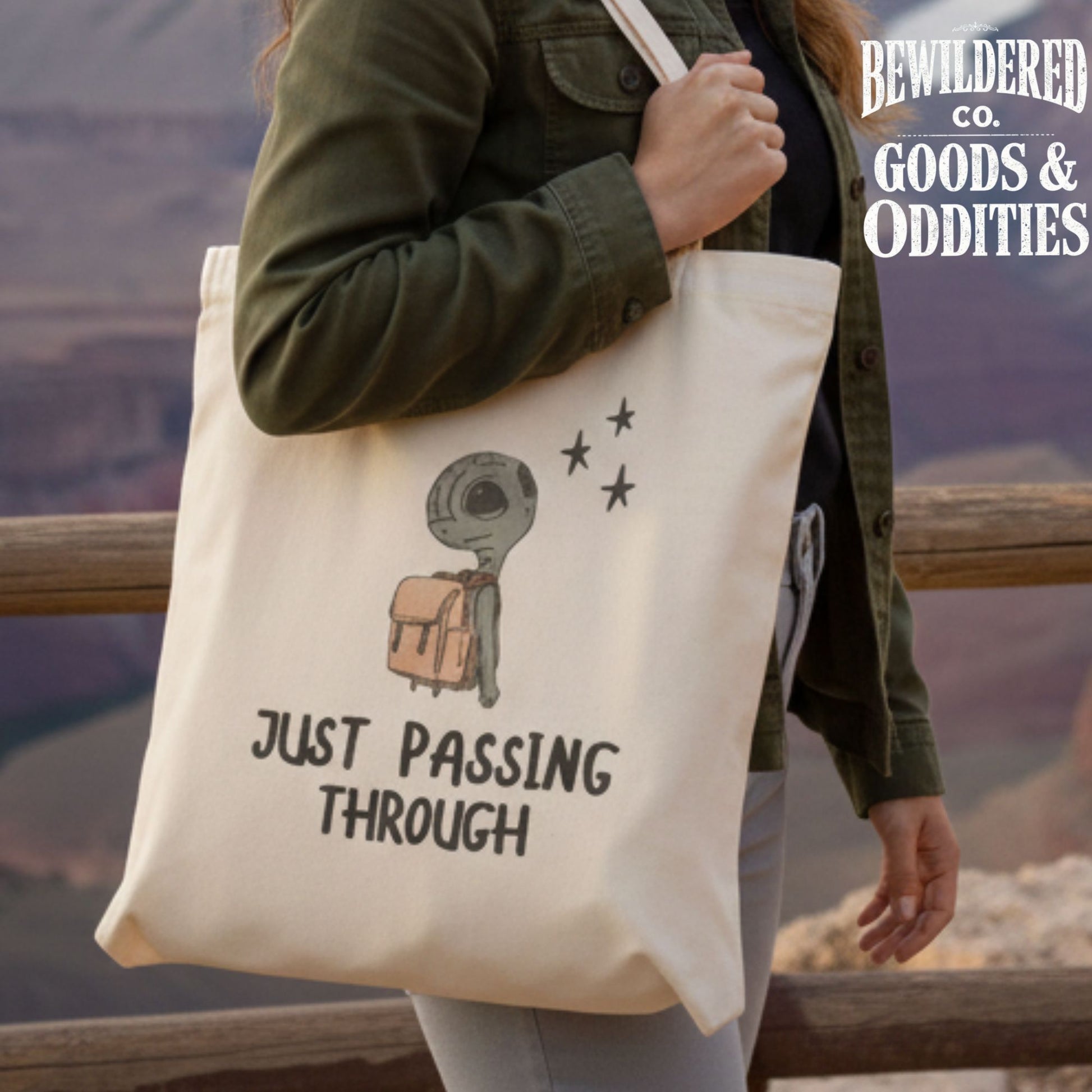 Just Passing Through Tote Bag — Bewildered Goods & Oddities Canvas Tote