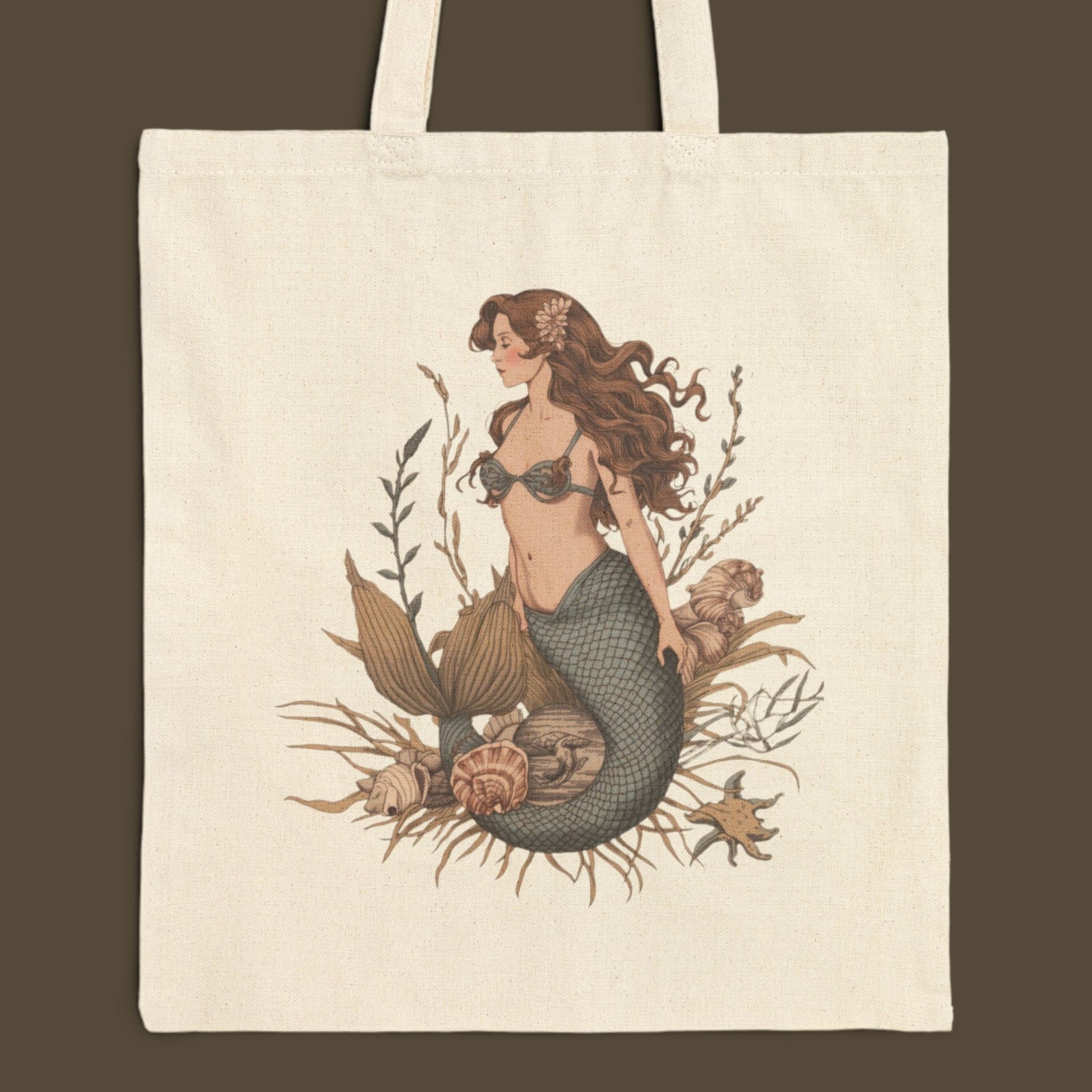 This cotton canvas tote carries a quiet, seaside nostalgia—softly worn and built to last. Printed with a vintage-inspired mermaid illustration framed by sea grasses and shells, it feels like a page torn from an old sailor’s sketchbook. The natural canvas and muted palette let the artwork breathe. Use it for market runs, library visits, or as an everyday carry that quietly signals a love of shoreline treasures and handcrafted charm.