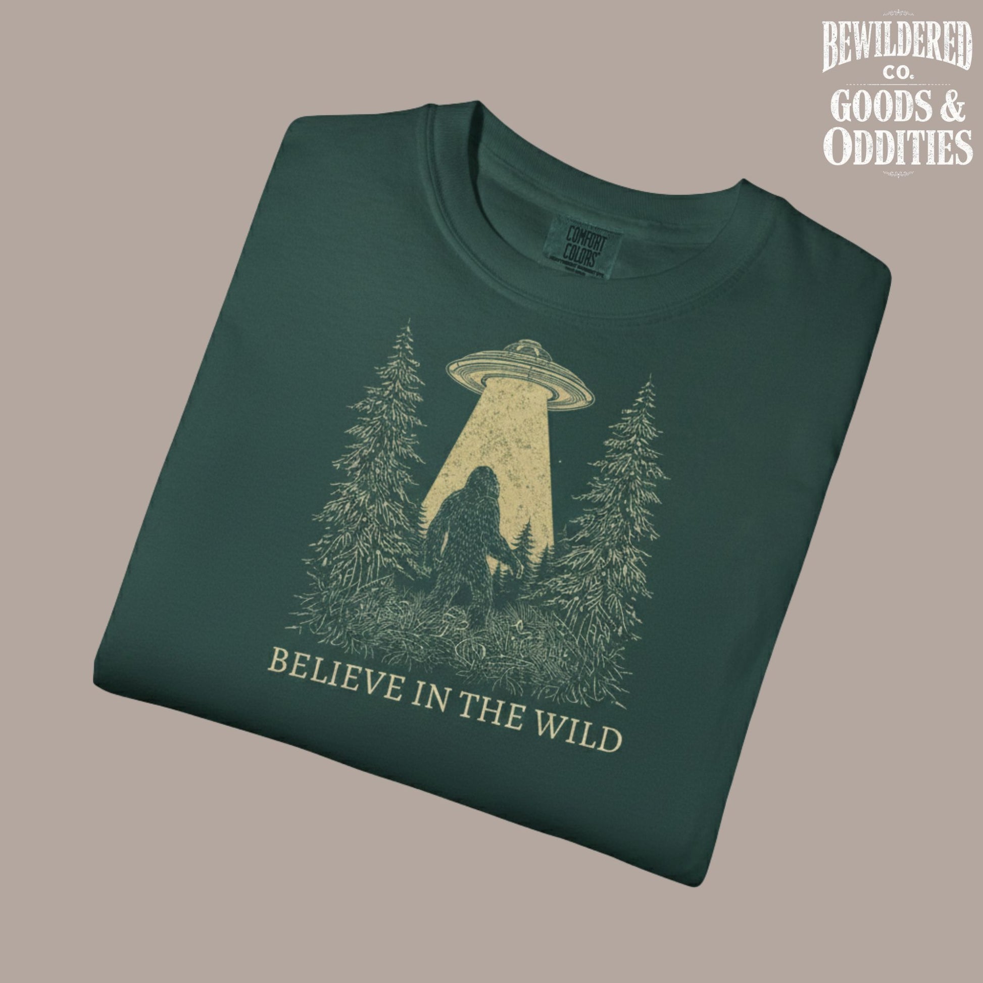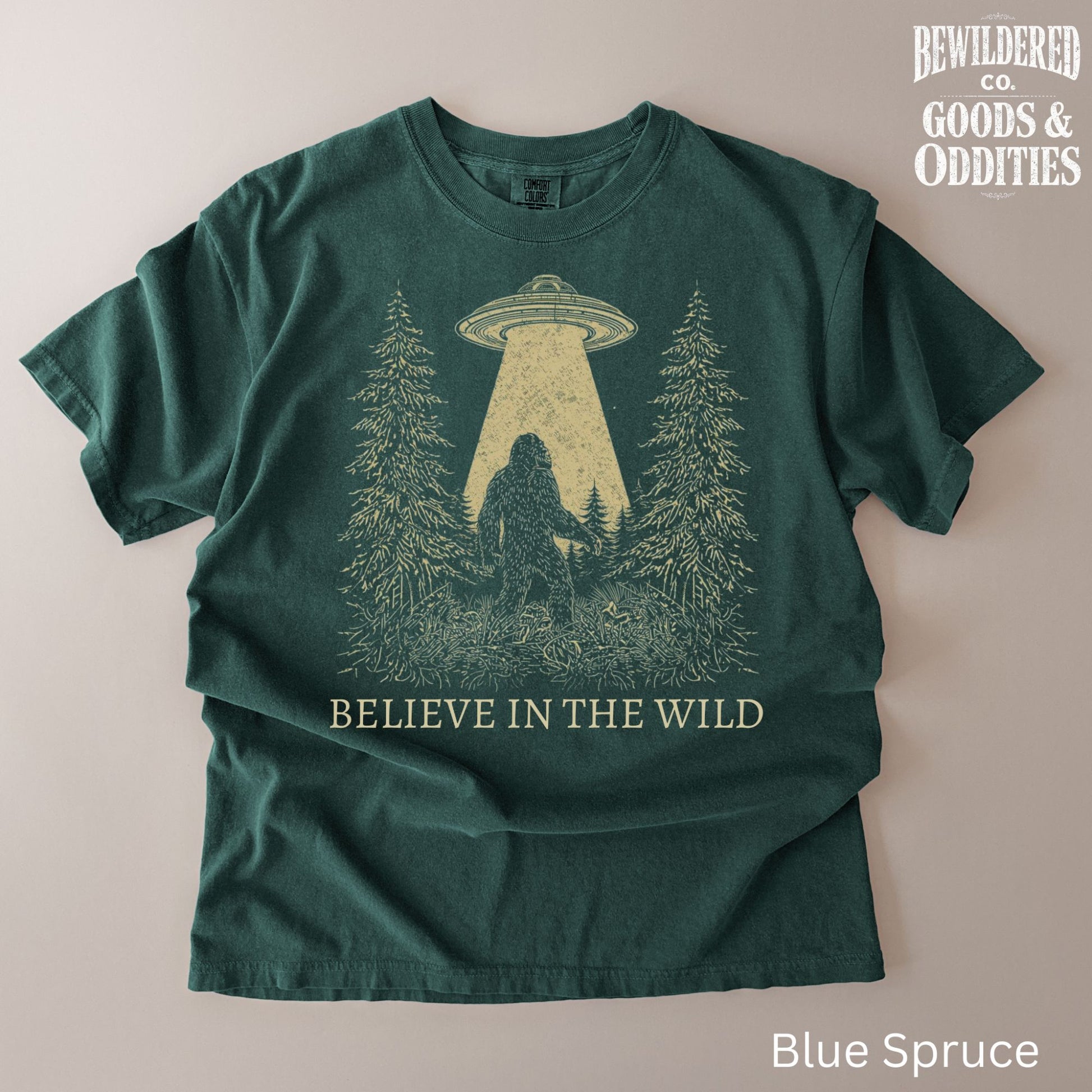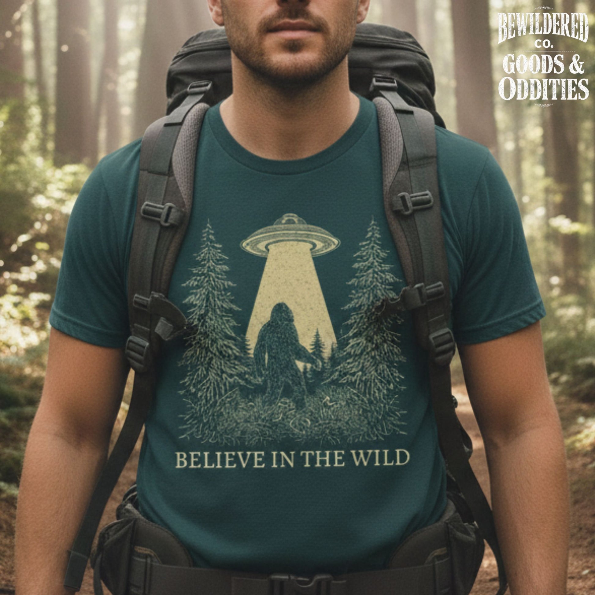 T-Shirt — 'Believe in the Wild' UFO Bigfoot Forest Graphic Tee